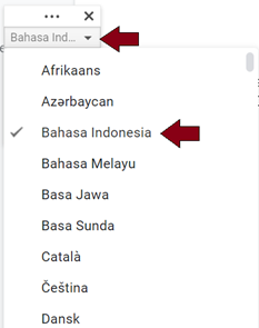 Jika kita ingin mengetik dalam bahasa Indonesia, maka terlebih dahulu kita harus mengeset bahasa Indonesia agar suara dapat dengan baik dikonversi ke tulisan oleh Google. Caranya adalah dengan menekan tombol segitiga di atas simbol microfon. Pilih bahasa yang Anda inginkan, misalnya Bahasa Indonesia.