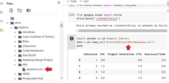 Perhatikan munculnya folder Drive di bagian File Google Colab. Selamat mencoba.