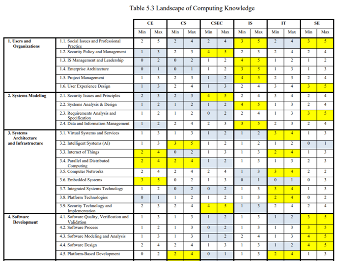 Jadi ketika suatu jurusan, misal teknik komputer (CE), maka boleh saja memasukan materi-materi bidang lainnya, namun khusus yang berwarna kuning harus ada. Kalau bisa yang abu-abu juga, mungkin dunia saat ini sedikit berubah karena adanya keterkaitan antara satu jurusan dengan jurusan lainnya. Ditambah lagi fenomena Gap Skill dimana ada beberapa skill yang tidak bisa disediakan oleh satu bidang komputer tertentu.
