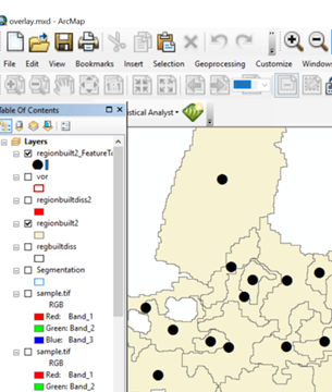 Voronoi dibentuk berdasarkan titik, oleh karena itu perlu dibuat titik pusat tiap region dengan fungsi feature to point yang dapat di-searching lewat fasilitas search. Hasilnya akan tampak seperti gambar di bawah ini.