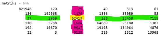 Nilai yang disorot warna hijau di atas merupakan FP dimana memprediksi kelas ke-3 tetapi hasilnya kelas yang lain. Sementara nilai yang disorot warna merah menunjukan nilai FN dimana ‘memprediksi yang bukan kelas ke-3 tetapi secara aktual (kolom) adalah kelas ke-3. Koding Matlab adalah sebagai berikut untuk kelas ke-3.