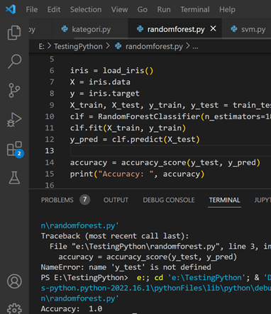 Dengan cara yang sama, copas kode masukan ke Visual Studio Code, jalankan dan ternyata diperoleh akurasi di atas LVQ, yakni 96.67%.