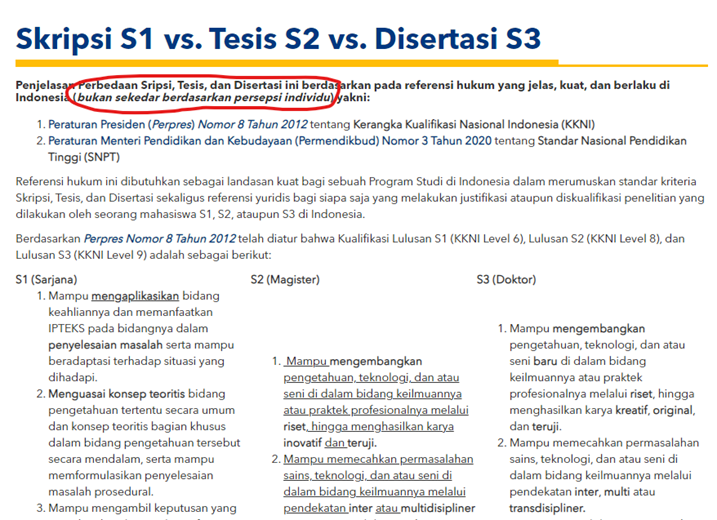 Sampai-sampai ditulis ‘bukan sekedar berdasarkan persepsi individu’. Sepertinya banyak dosen-dosen yang memberi beban yang tidak/kurang tepat ke mahasiswanya. Biasanya memaksa siswa S1 melakukan riset dengan beberapa research question dengan harapan ada novelty, padahal standar minimal KKNI Sarjana adalah cukup bisa mengaplikasikan IPTEKS, menguasai teori, dan seterusnya. Walaupun boleh saja melebihi standar minimum, asalkan tidak memaksa khawatir melanggar UU. Kampus sekelas ITS saja masih menggunakan standar minimal.