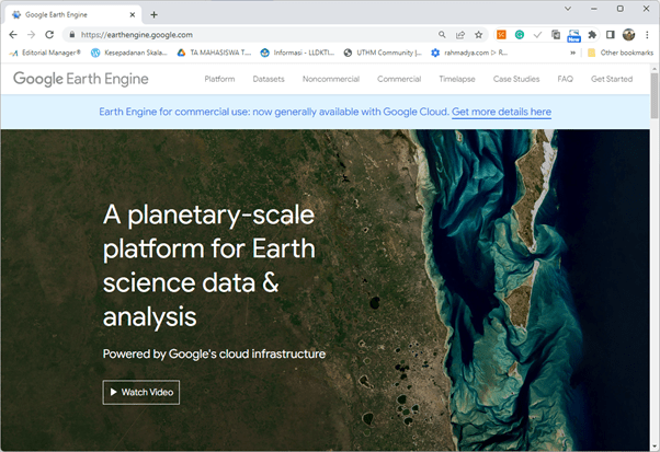 Google Earth Engine (GEE) adalah platform komputasi awan gratis yang disediakan oleh Google untuk mengakses, memanipulasi, dan menganalisis data geospasial dari berbagai sumber, termasuk citra satelit, peta, dan data lainnya. Platform ini dikembangkan oleh Google untuk membantu para peneliti, pengamat, dan praktisi di berbagai bidang ilmu, seperti lingkungan, penginderaan jauh, konservasi, pertanian, dan perubahan iklim, untuk melakukan analisis spasial yang cepat dan akurat menggunakan data yang besar dan kompleks.