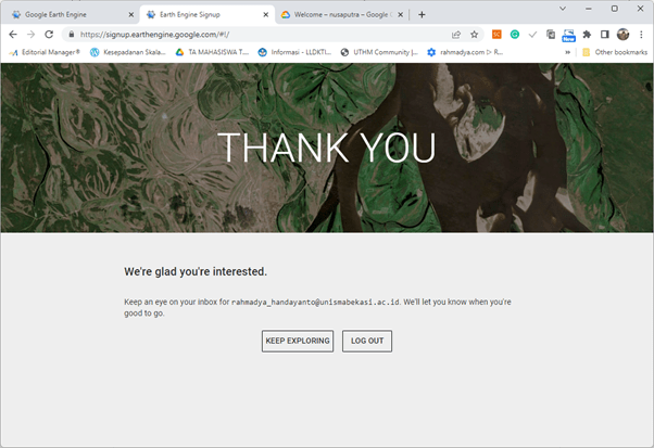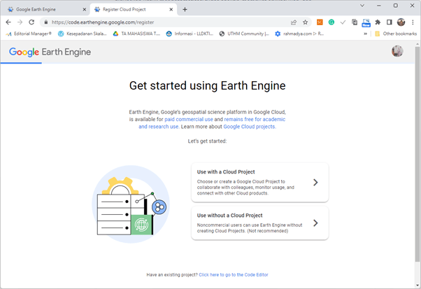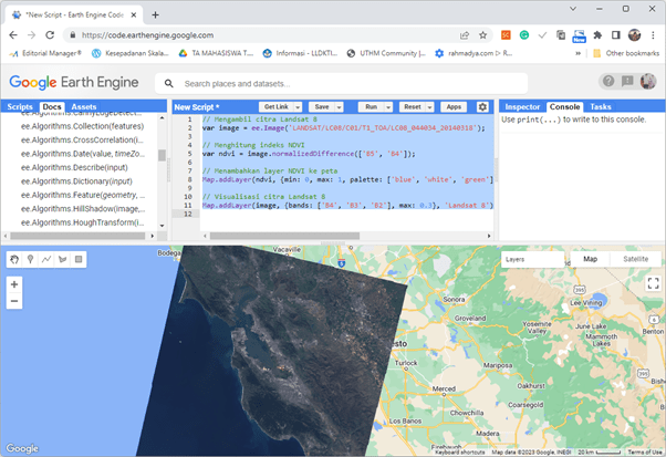 Buka halaman Google Earth Engine di https://earthengine.google.com/. Klik tombol “Sign In” di sudut kanan atas halaman. Masukkan akun Google Anda untuk masuk ke Google Earth Engine. Setelah masuk, Anda akan diarahkan ke halaman beranda Google Earth Engine. Di sini, Anda dapat menemukan berbagai jenis data dan alat untuk memulai analisis geospasial Anda. GEE memungkinkan pengguna untuk mengakses data geospasial dalam jumlah besar dari berbagai sumber seperti Landsat, Sentinel, MODIS, dan banyak lagi, dan menyediakan berbagai alat analisis seperti penginderaan jauh, statistik, pemrosesan citra, dan pemodelan spasial.