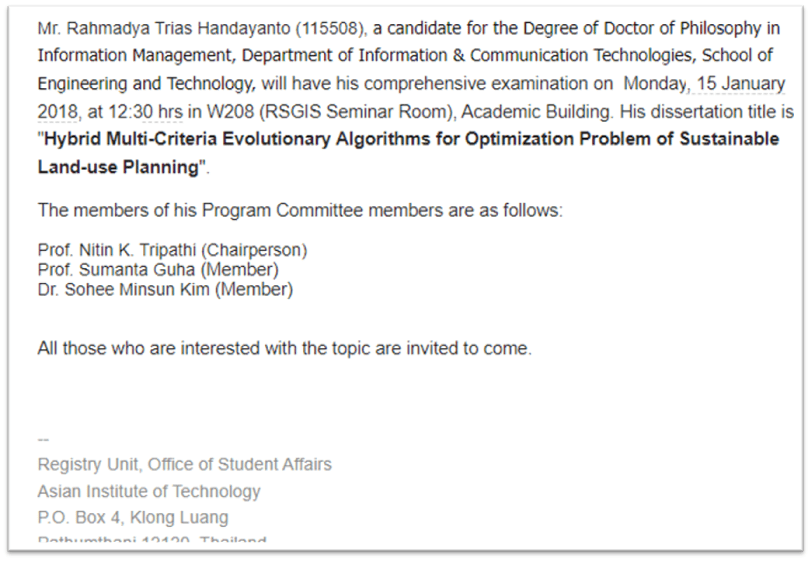 “Halo apa kabar? Bagaimana keadaan di sana?”, sapa telepon itu. Seperti biasa, walau sedang pusing tapi cukup dijawab dengan dusta, “baik, bagaimana dengan Anda?”. Intinya ternyata hanya bertanya-tanya perihal kampus tempat saya kuliah. Tadinya saya fikir dari tim pewawancara waktu mendaftar beasiswa DIKTI ternyata hanya survey. “Apakah di sana ada sidang terbuka?”, saya jawab kalau seperti di Indonesia yang mengundang orang sekampung, disertai acara makan-makan, pembagian souvenir, dan sejenisnya ya tidak ada. Paling hanya informasi seperti berikut ini.