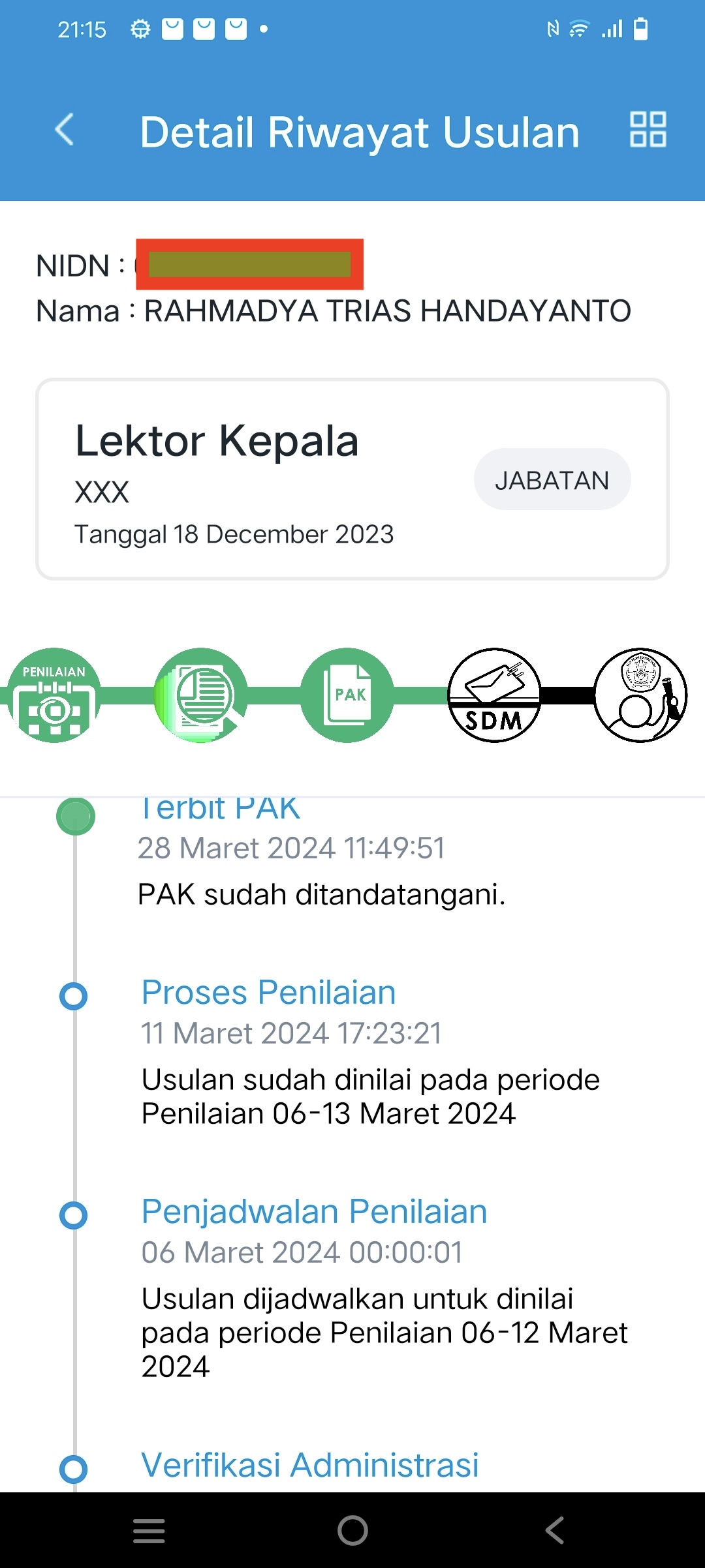 Jika berhasil, dua minggu kemudian akan muncul tahapan berikutnya yakni terbit PAK. Untuk yang kurang beruntung pada tahapan ini muncul notif warna merah yang artinya ada yang perlu diperbaiki. Dengan aplikasi ini proses yang dulu kabarnya bisa sampai 2 tahun sekerang beberapa bulan saja. Yuk mengurus Jabatan Fungsional.