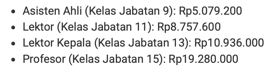 Beberapa waktu yang lalu ASN dosen menagih janji tunjangan kinerja (di luar tunjangan sertifikasi dosen) sesuai janji menteri sebelumnya. Bagi dosen swasta kelas menengah, tunjangan itu cukup besar.