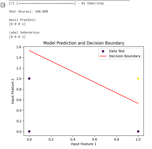 Perhatikan bagaimana Delta Rule melakukan perubahan bobot dan bias dibanding SGD dimana yang satu menggunakan error, SGD dengan gradien yang diambil dari derivatif/turunan sinyal output. Juga pada bagian bias-nya. Termasuk dengan chatGPT bisa juga langsung menanyakan grafik boundary, dengan Google Colab. Ini contoh untuk kasus penyelesaian logika AND, nah silahkan coba kasus lainnya. Di sini ternyata untuk logika XOR tidak bisa dengan 1 neuron.