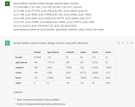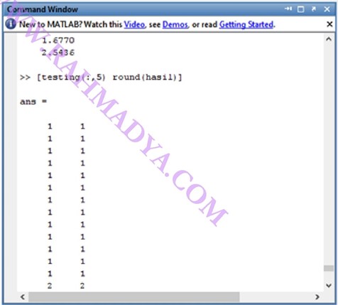 Cara membaca matriks confusion adalah sebagai berikut. Kolom merupakan prediksi sementara baris adalah aktualnya (dalam hal ini sama dengan target (testing di kolom kelima). Fungsi “round” ditambahkan pada hasil untuk mencari kelas prediksi terdekat, misalnya 2.7 dikategorikan kelas “3”. Diagonal pada matriks confusion menyatakan akurasi. Perhatikan di baris kedua kolom ketiga, di sini harusnya 13 tetapi berisi 12 karena ada satu prediksi 3 (baris ketiga) tetapi kenyataannya 2 (kolom kedua).