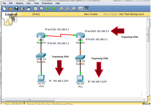 Pertemuan minggu lalu sudah dilaksanakan praktek mengeset IP diagram di bawah ini pada sistem operasi Windows Xp. Sekarang coba setting pada sistem operasi linux Ubuntu dengan alamat network: 202.134.168.160/27. Berikan alamat IP di empat desktop yang ada dengan tepat, coba dulu dengan Packet Tracer sebelum diimplementasikan. Jangan lupa, di sini “/27” berarti subnetting dengan subnet: 255.255.255.224.
