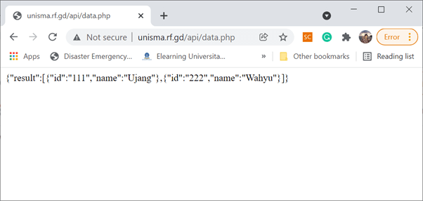 Sebagai bukti servis dapat dimanfaatkan oleh aplikasi lain, lewat browser kita dapat langsung mengakses “data.php” yang berisi data siswa. Tentu saja perlu menambahkan API key agar menjaga akses dari pihak-pihak yang tidak diijinkan, terutama untuk service POST dan PUT yang menginput dan mengedit data. Untuk jelasnya silahkan lihat video berikut, semoga bermanfaat.