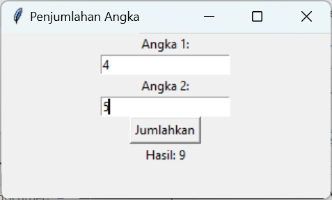 Jika sudah siapkan aplikasi dengan TKinter, misalnya menjumlahkan secara sederhana dua angka. Untuk gampangnya silahkan tanya saja ChatGPT untuk samplenya.