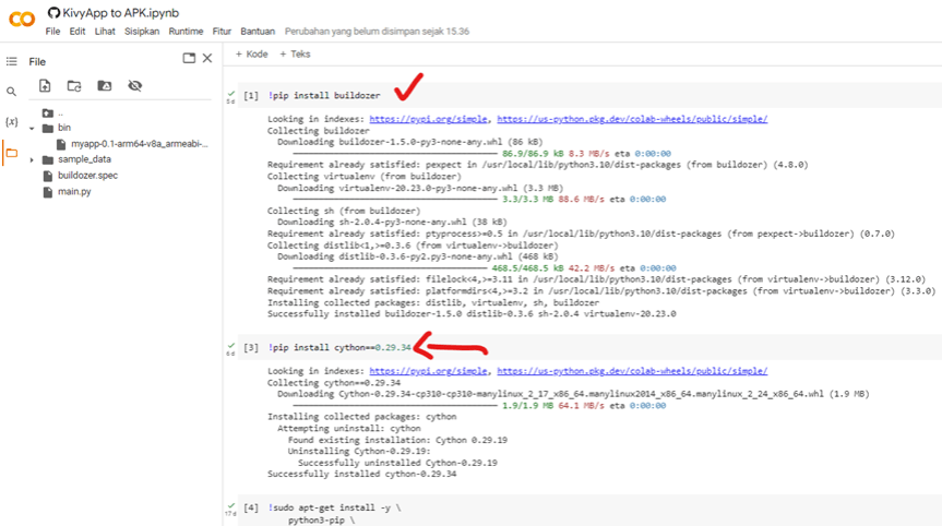 Perhatikan setiap instalasi pada cell di colab jangan sampai ada error (berwarna merah). Ketika inisialisasi, buldozer.spec muncul dan siap dijalankan, juga dengan Google Colab. Ganti nama aplikasi, tampilan splash dan icon. Untuk requirements di baris ke 40 tambahkan library-library yang digunakan, beserta versinya, misalnya kivy==2.2.0. Library lain tambahkan jika ada di impor pada header python, misal pillow, tensorflow, dll.