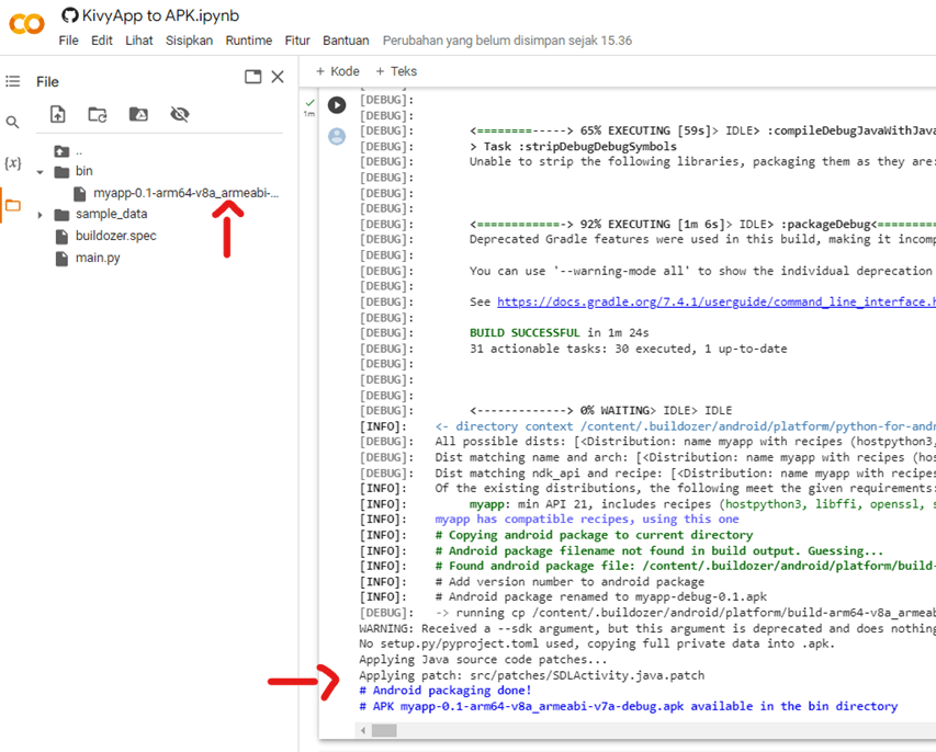 Nah, repotnya adalah proses kompilasi yang hampir setengah jam. Jika sudah tinggal dipindah apk yang dihasilkan untuk diinstal di handphone. Lokasi apk ada di folder bin. Pastikan Android paket sudah selesai terbentuk di bagian akhir google colab.