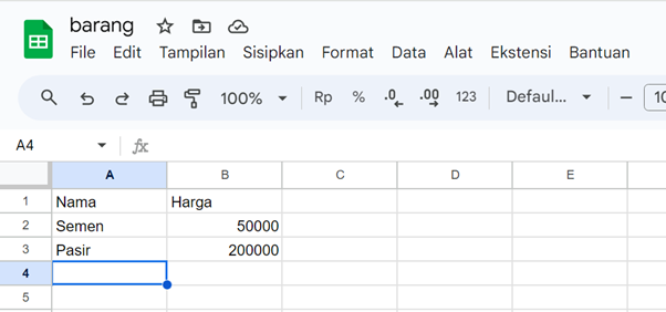 Misal kita akan membuat tabel harga satuan barang untuk keperluan bangunan seperti semen, pasir, dan lain-lain. Buka Google Sheet [link]. Buat tabel baru dengan nama misalnya barang. Buat dua kolom dengan dengan nama kolom: Nama dan Harga.