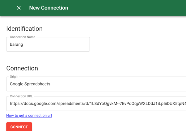 Setelah menekan START FREE login dengan Google Anda, lalu buat koneksi baru. Isi link Google Sheet yang sebelumnya sudah dishare full access. Isi field-field yang dibutuhkan, seperti Identification dan Connection URL.