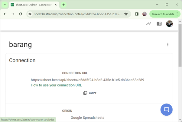 Tunggu beberapa saat hingga proses koneksi selesai. Untuk melihat link API yang baru saja dibuat, tekan DETAILS di bagian bawah CONNECTION.