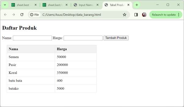 Lanjutkan dengan prompt ketiga: ‘tambahkan di bagian atas tabel isian/form input Nama dan Harga barang yang datanya isiannya dikirim ke API: <link API>.